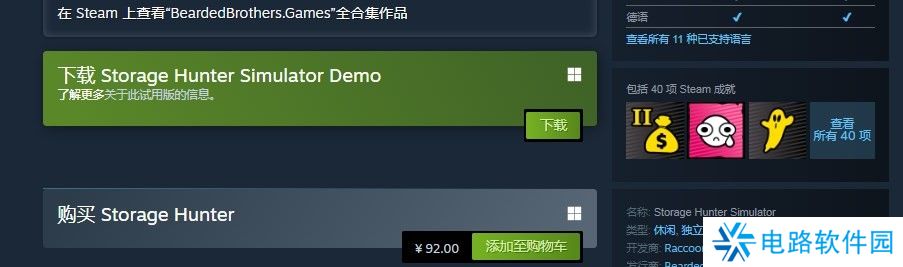 《仓储猎手模拟》在Steam平台有标准版,售卖价格分别是人民币92元。