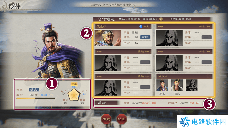 合作候补越多,触发合作的概率越高。触发合作后,指令的效果或与合作武将间的亲密度提升。