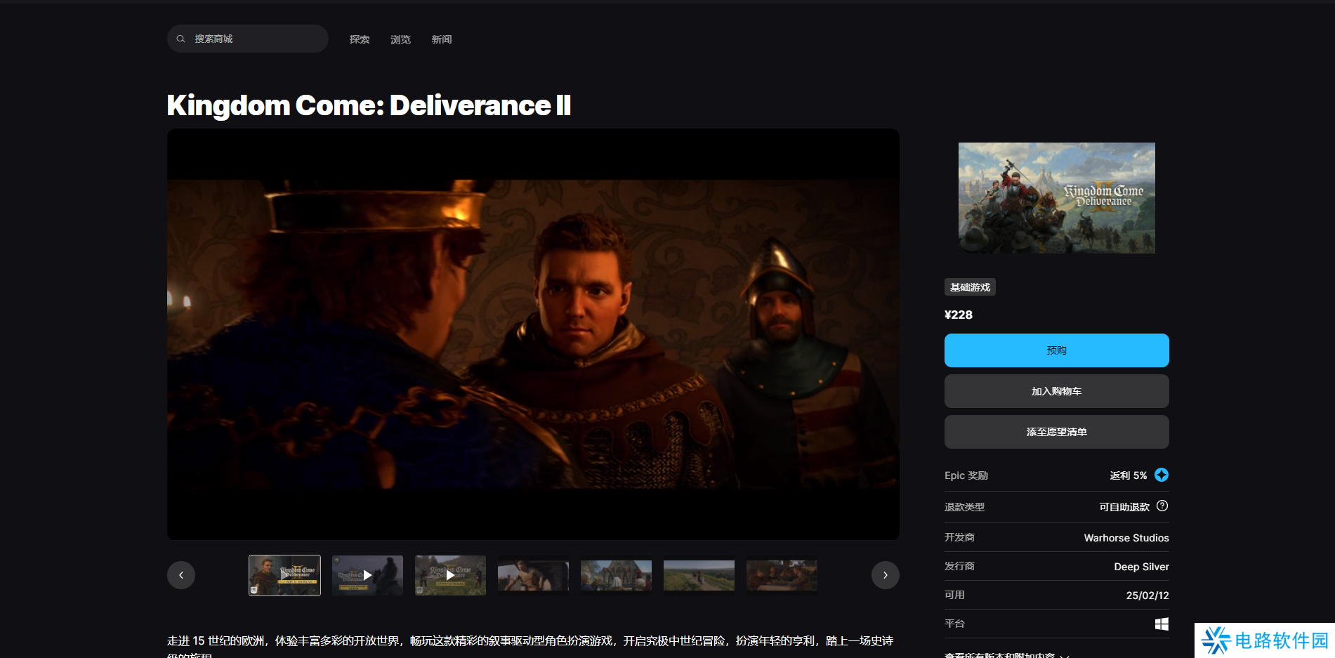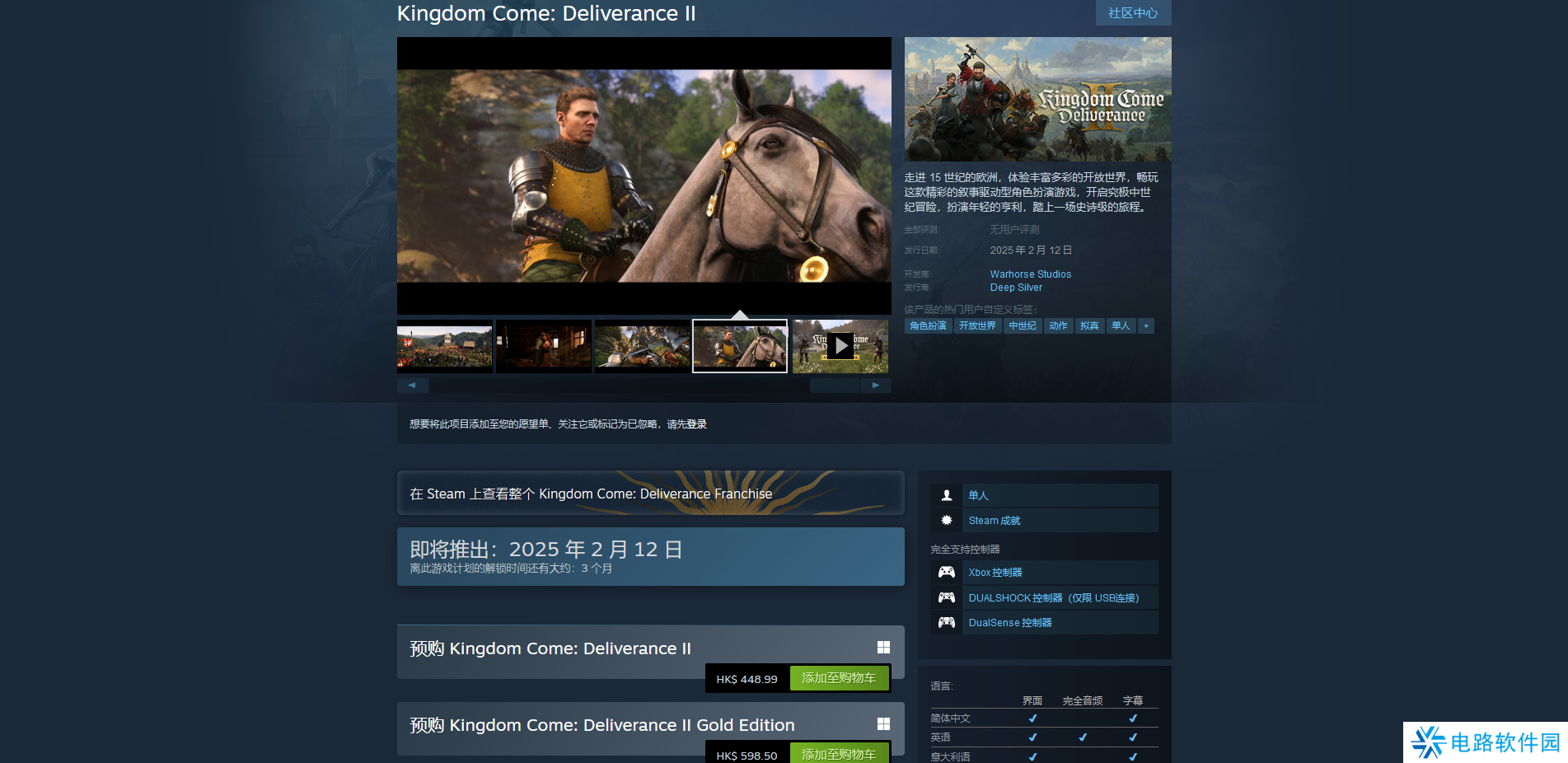 《天国:拯救2(Kingdom Come: Deliverance II)》Steam版的上线时间为2025 年 2 月 12 日上午10点左右,预载时间大概是前一天,也就是2月11日。