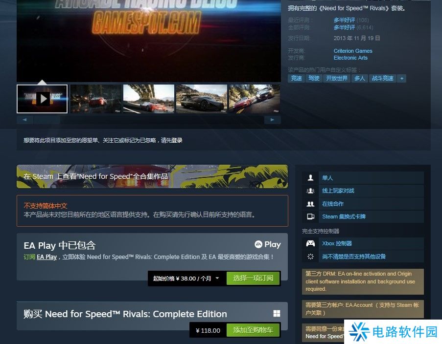 Steam平台购买链接:https://store.steampowered.com/app/1262600/Need_for_Speed_Rivals/