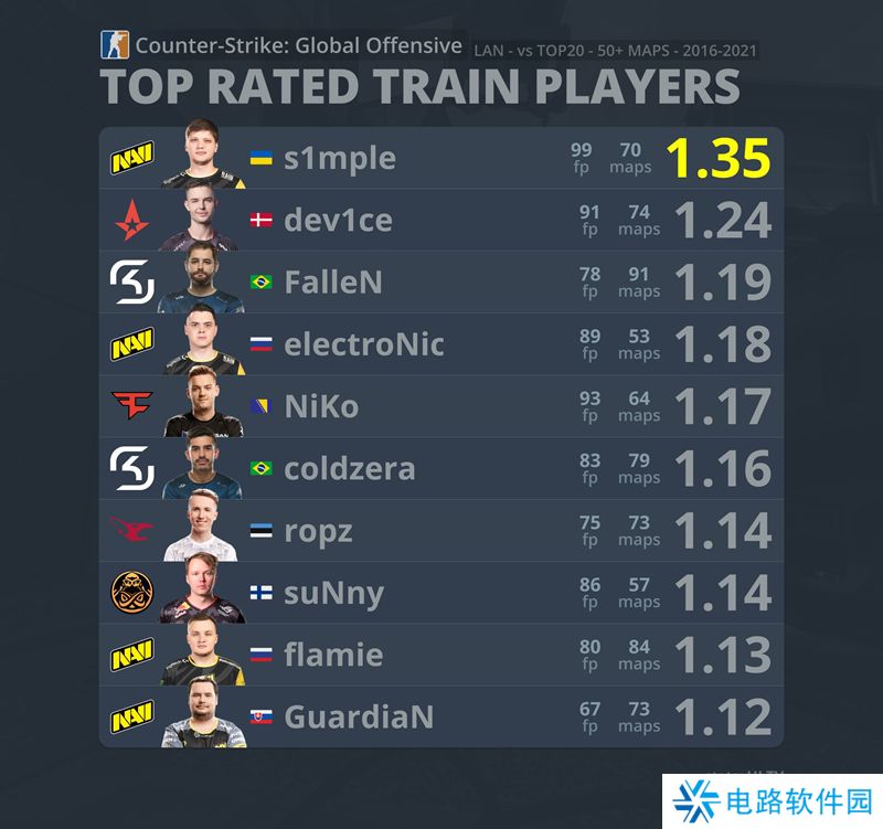 作为在Train具有统治地位的选手,s1mple以1.35 rating排名第一;拉开了第二名device 0.11 rating差;第三名FalleN则有着1.19 rating;第四名则是当时NAVI的二当家electroNic;波黑步枪手NiKo以0.01 rating的劣势紧随其后。