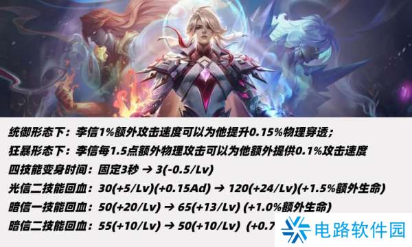 ①李信光明形态:每1%额外攻速提升0.15%物理穿透,二技能回血提升基础数值,AD加成改为额外生命值加成。