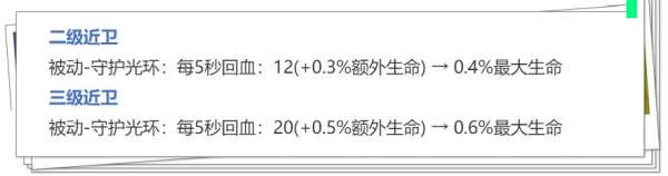 近卫辅助装的被动每5秒回血,从额外生命值改为最大生命值加成,小幅提升了坦辅出近卫辅助装的续航能力。