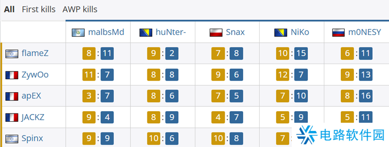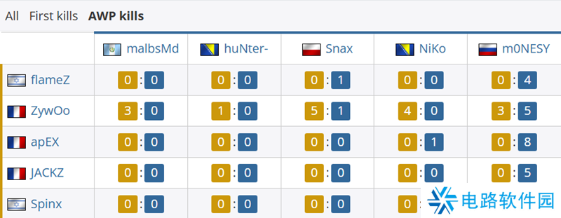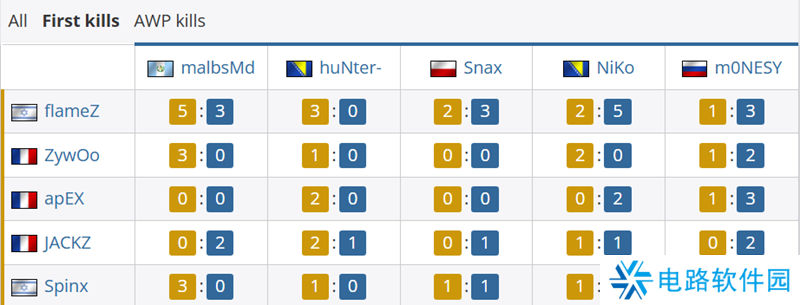 首杀对位上,flameZ一共为队伍拿到了13个首杀,而Spinx拿到了8个首杀。G2方面拿到首杀最多的是m0NESY,一共10个首杀。