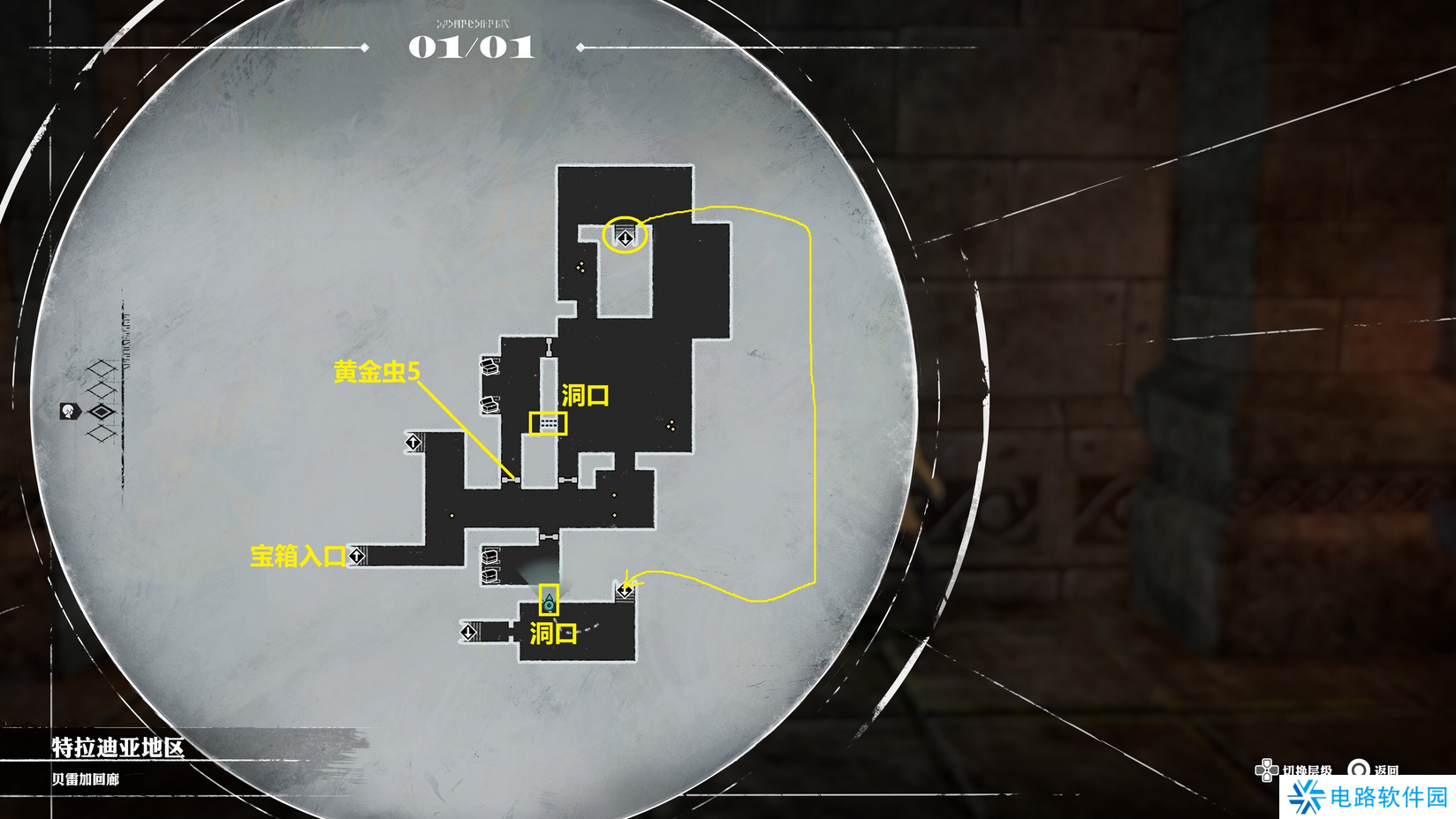 《暗喻幻想:ReFantazio》中的黄金虫5是游戏里很重要的特殊收集品,但是很多玩家都不太清楚黄金虫5在哪里可以获得,其实黄金虫5获得可以去贝雷加回廊,进入地下2层,如图正中间的洞口进去。