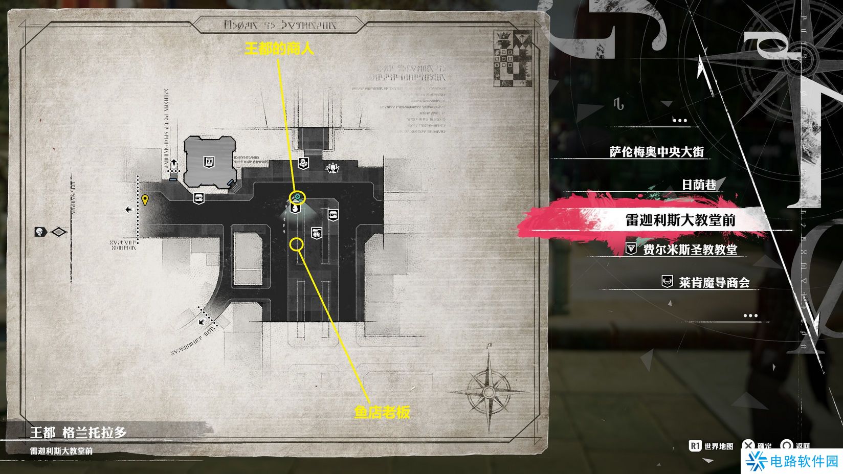 7月28日,白天,瞬移到王都 格兰托拉多,雷迦利斯大教堂前,如图俏皮的卖水人南部,马车旁找到鱼店老板,往北走,俏皮的卖水人北部,与王都的商人对话,选“鱼腥味很大吗? 创思LV3”,剧情。