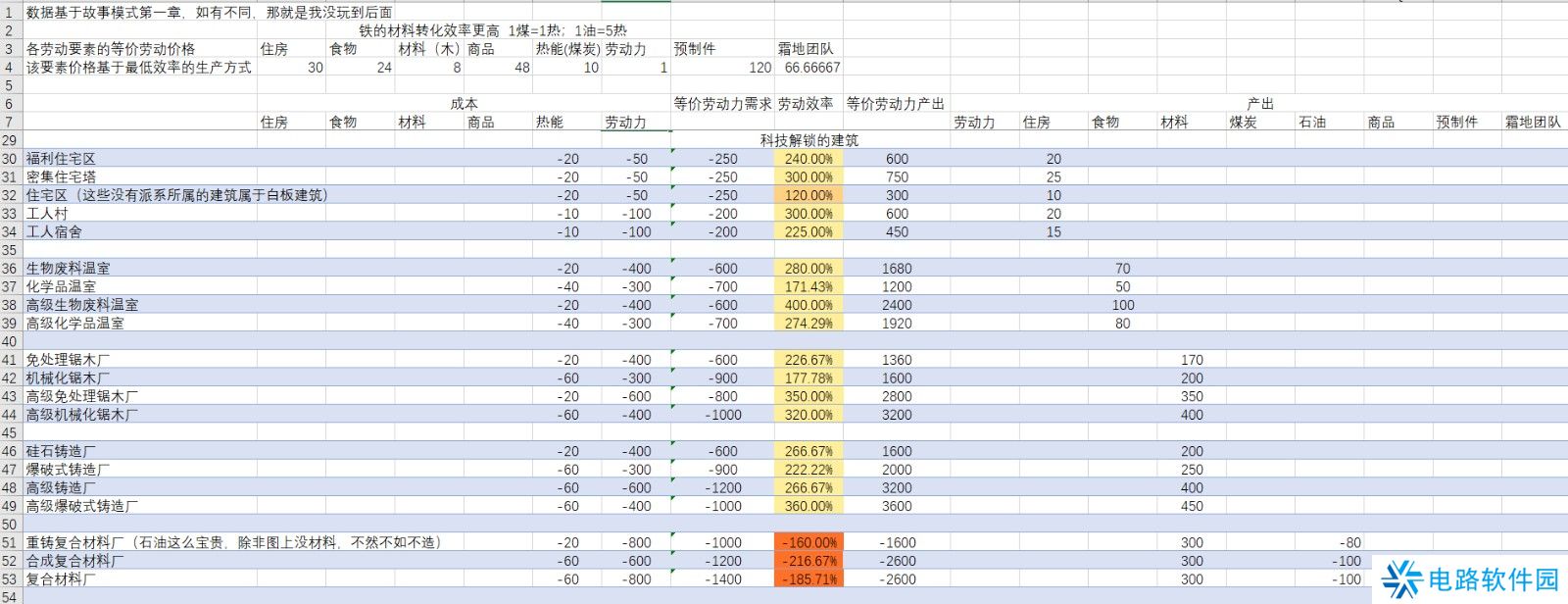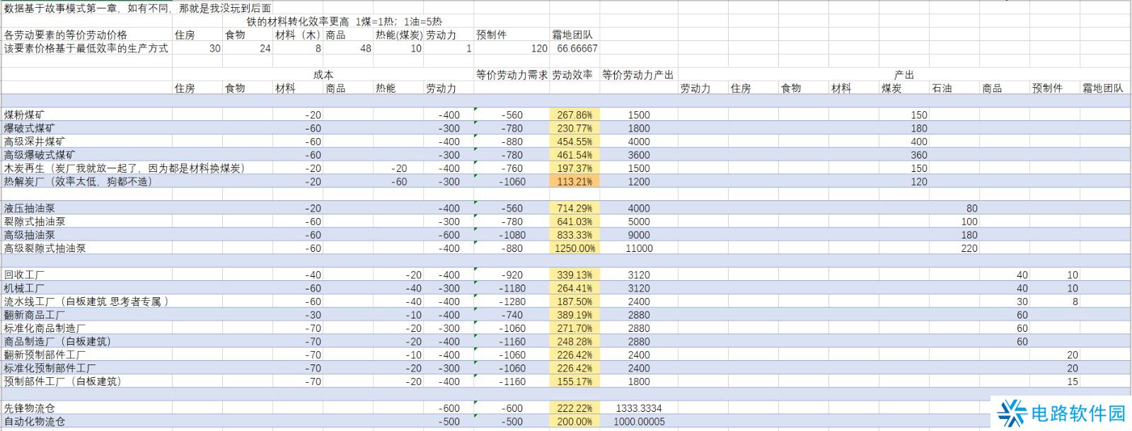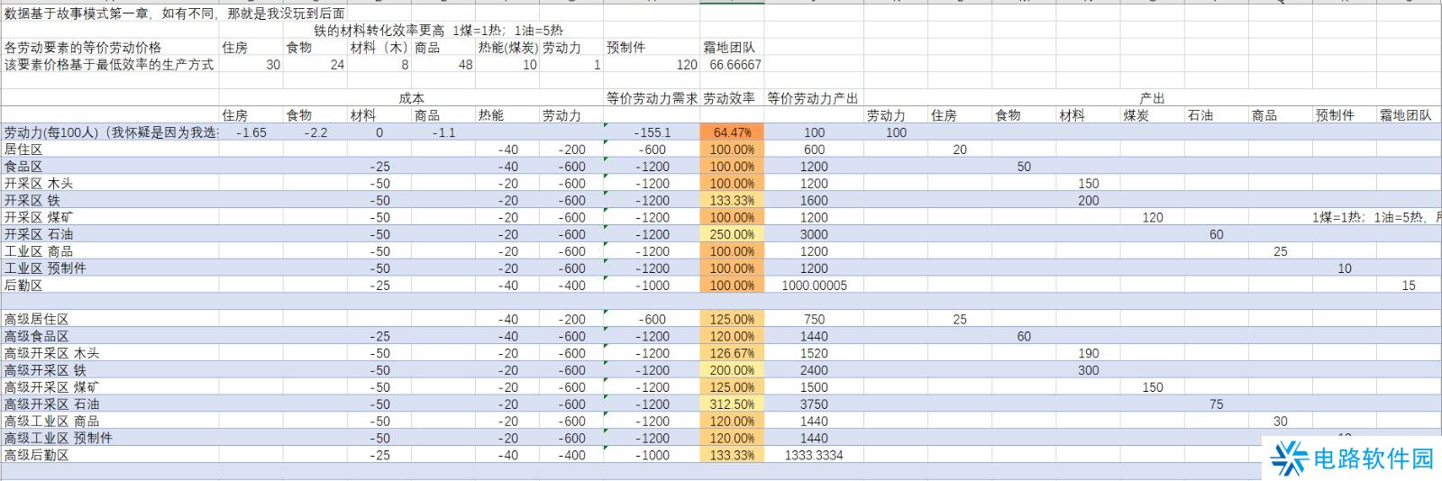 没有标准的分析难以成立,这里我借用了现实世界的劳动价值论,以各个劳动要素的等价劳动力作为衡量效率的中介,各个劳动要素的价格如下:住房 30(劳动力每个,下同) ,食物 24,材料8,商品48,热能 10,预制件120,霜地团队66.666