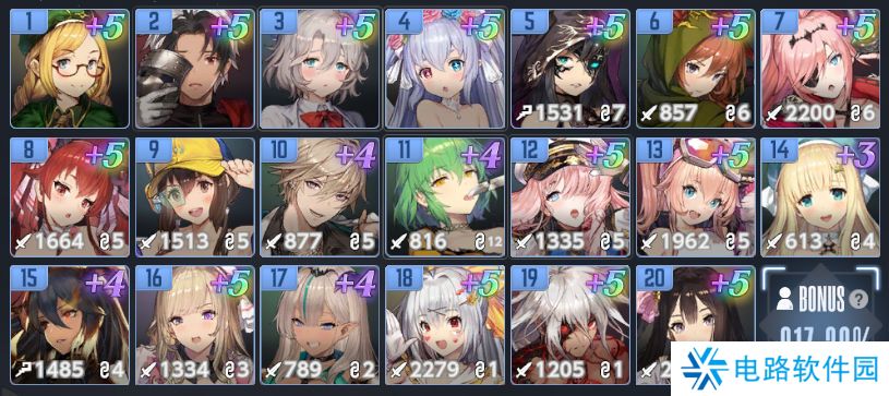 可以看到其配队逻辑:上buff角色排最前面,第二排全是叠连击的角色,叠高连击增伤,然后是自身破度比较高,练度比较高的输出角色,最后用高倍率的单段伤害收尾。