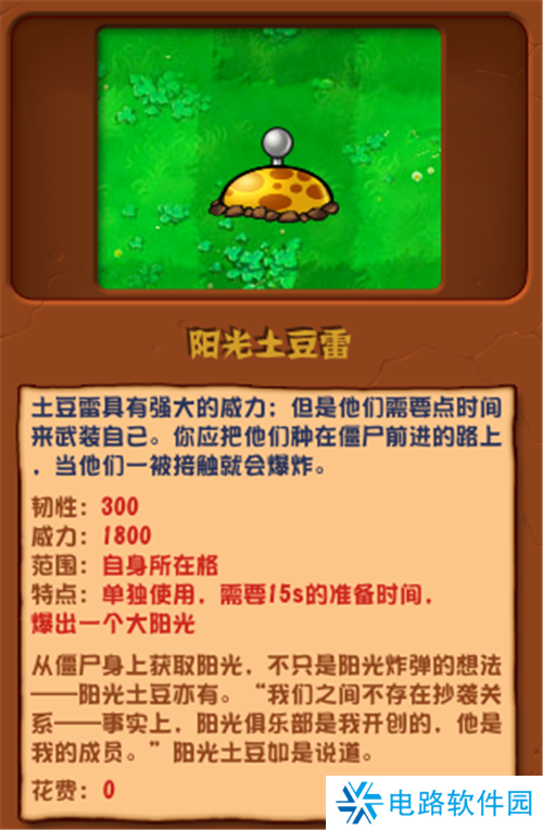 评价:樱桃炸弹与向日葵的完美结合,适合在僵尸潮时清场并获大量阳光。非紧急情况,阳光土豆更为优选。