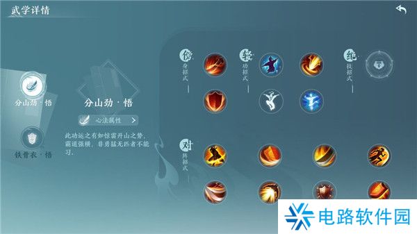 苍云分山劲:外功近战,擎刀姿态对敌人进行连续追击,盾墙姿态下,具有不错的防御力, 擎盾姿态下,则具有均衡的综合能力。